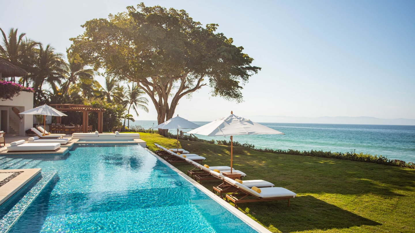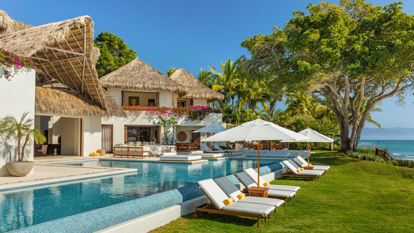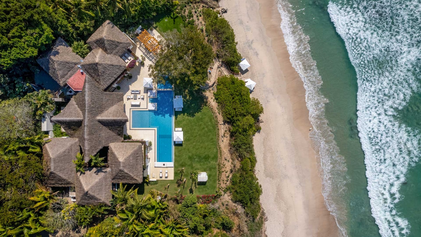 This wow-factor beachfront rental home in Punta Mita offers cool ocean breezes and magnificent views of the Marietta Islands for large groups seeking blissful privacy.
