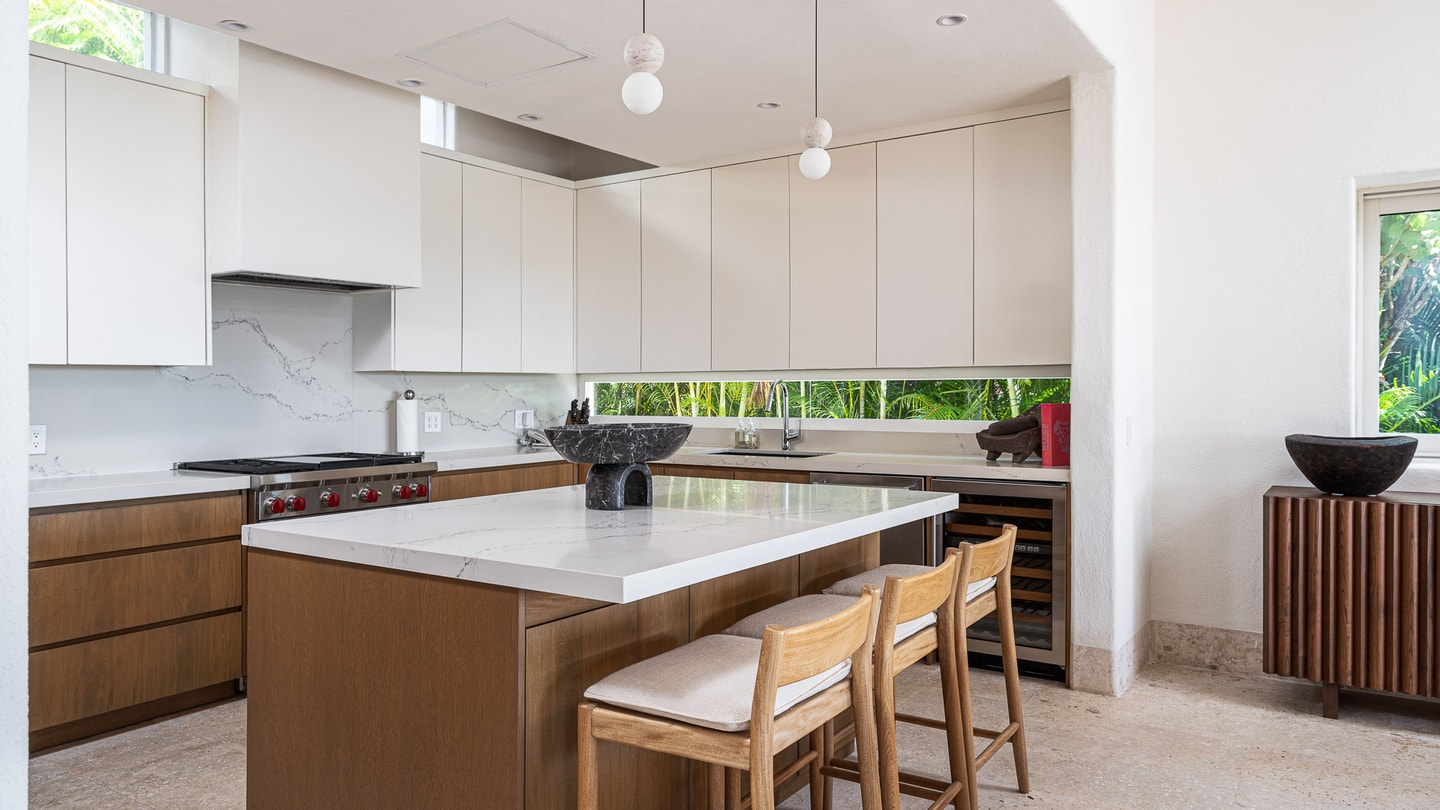 A delicious, renovated kitchen with inviting central island hosts a friendly face each morning as the housekeeper prepares your breakfast (groceries $). Its open plan leads to the modern dining area and access to the terrace.