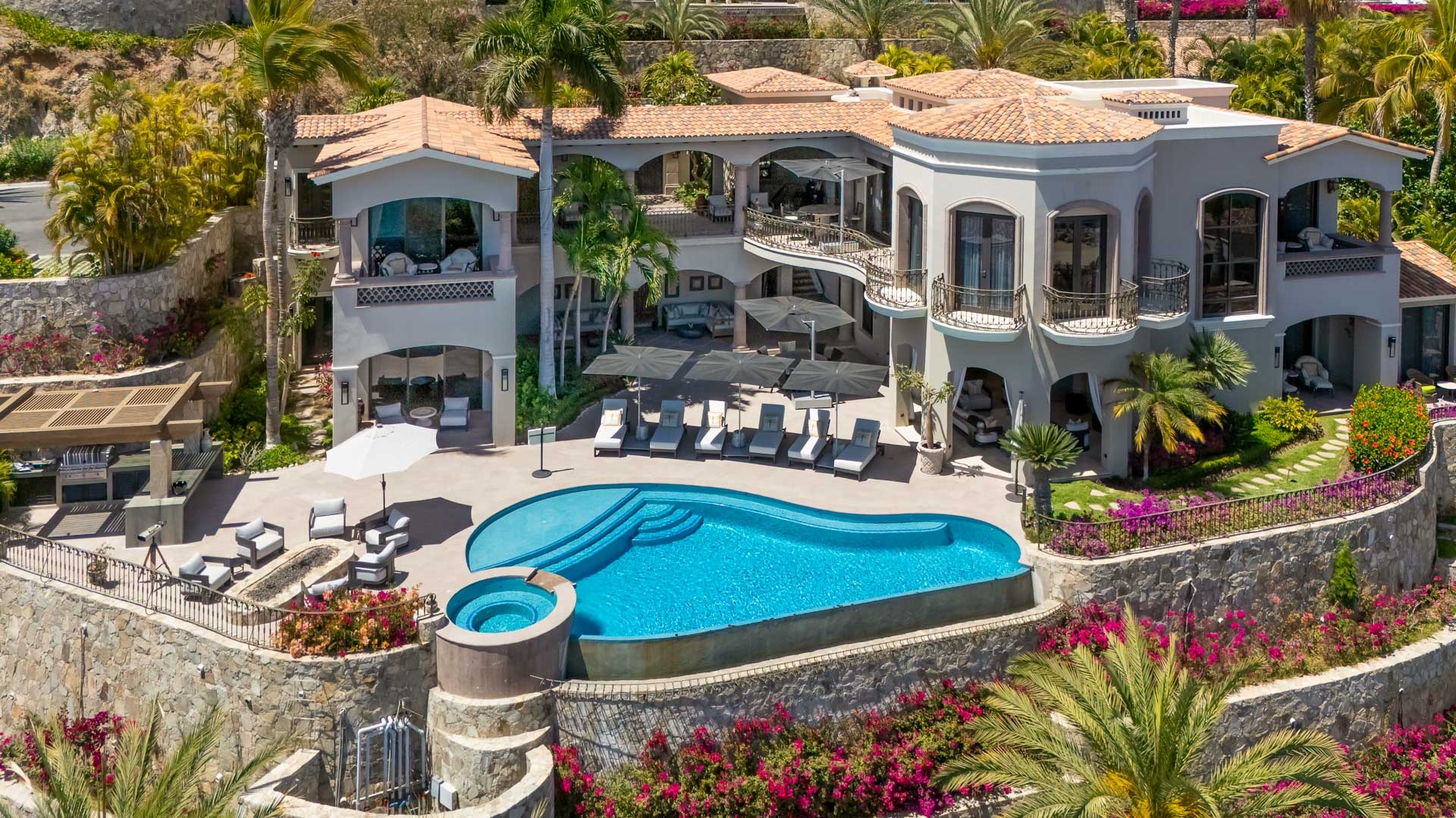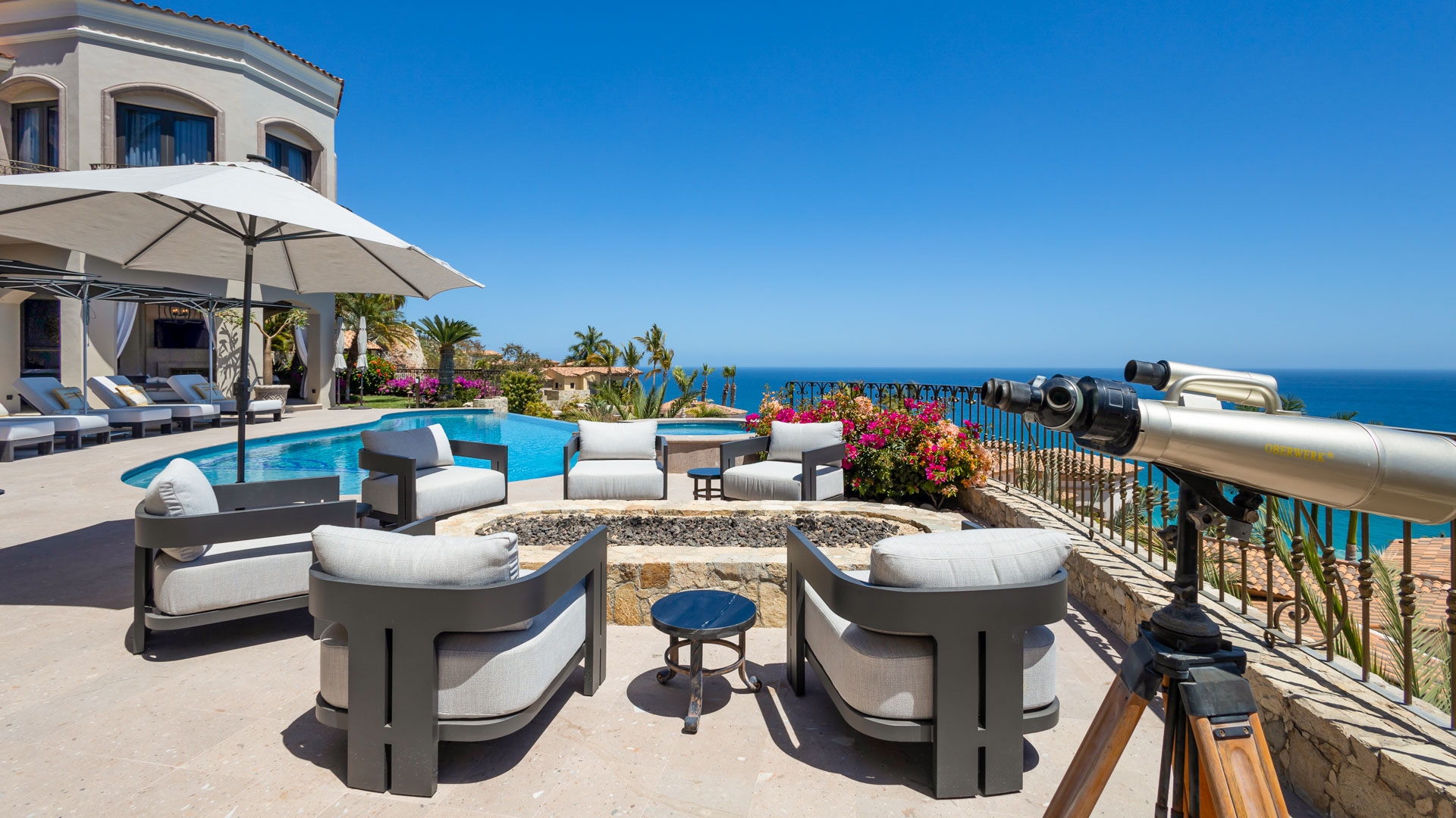 Imagine you and your favorite companions in this two-story ocean-view Cabo villa bursting with palatial touches and a distinctive Mediterranean flair. Indeed, you will feel like you have stepped back in time with its romantic lighting, wrought iron fixtures, chandeliers, and travertine fireplaces.