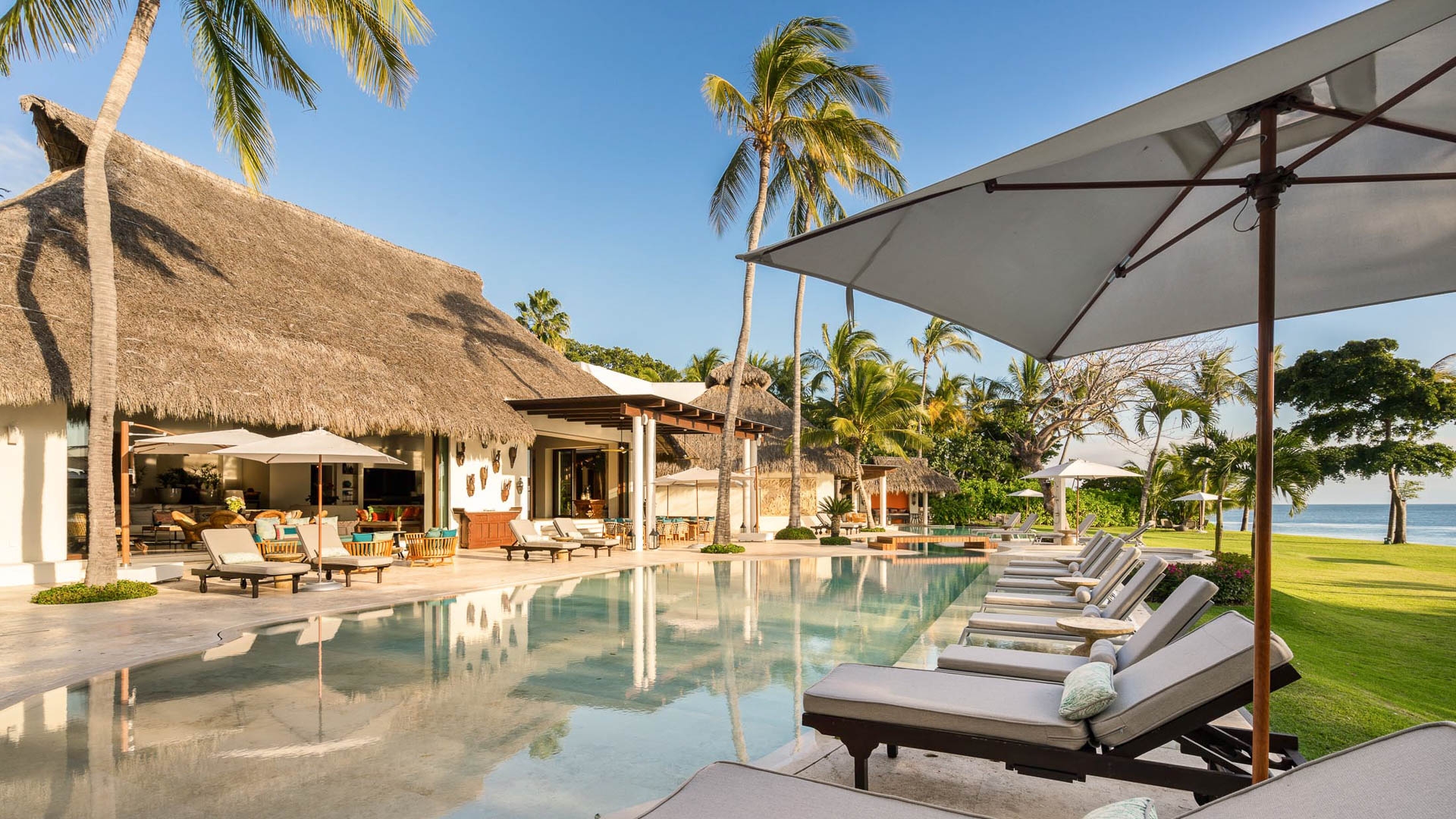 This private beachfront villa is in the most coveted Ranchos Estates community, part of the exclusive Punta Mita Development. Situated on a beautiful white sand beach, the home is within easy walking distance of several small bays where you can enjoy swimming, snorkelling, kayaking and other water sports.