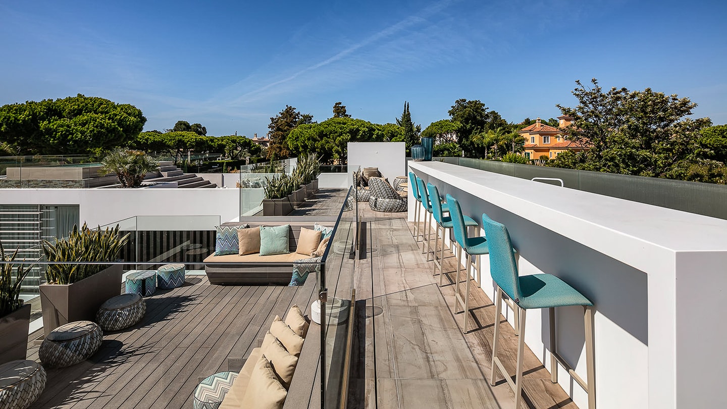 In addition to the main outdoor swimming pool on the ground level, the rooftop terrace is also crowned by a trendy plunge pool where you can hang at the bar or chill in the lounge, all while taking in the breathtaking lake views. However, what makes this home an all-season Algarve luxury rental option is its indoor pool on the lower level with a glass window to the ground level pool. Here, you can hop from pool to Turkish bath or sauna … and repeat! The gym overlooking the lake also makes working out on your holidays a treat.