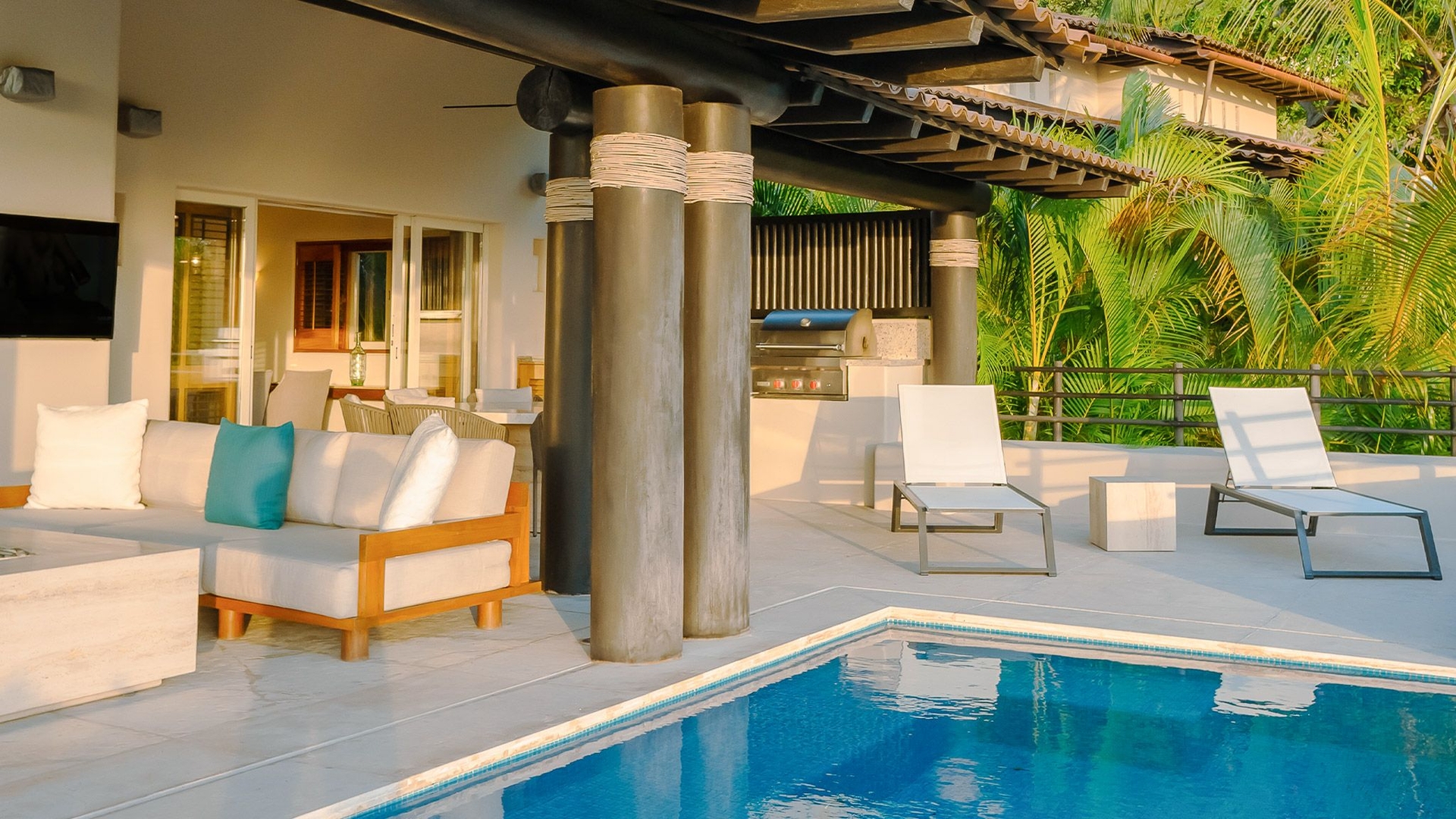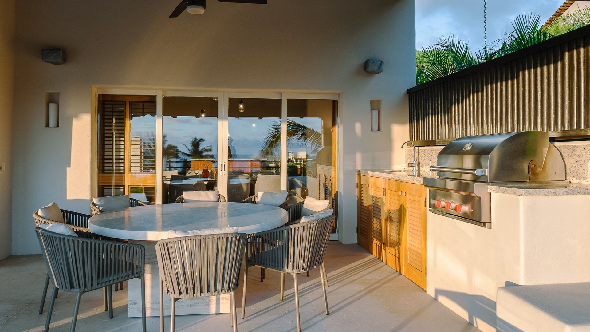 Inside, the understated living areas are airy and inviting, accented with subtle blue details like patterned cushions, a dining area rug, and small decorative touches that bring in a coastal calm. A fully equipped kitchen connects seamlessly with the indoor lounge and adjacent wet bar, making it a lovely setting for both quiet mornings and laid-back gatherings.